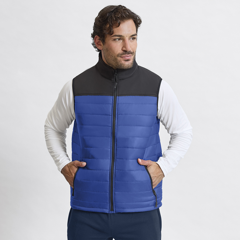 Waterdicht en ademend vest in combinatie met soft shell en polyester materialen. In een elegante zwarte kleurconstructie, met ritssluiting en zijzakken met rits, met trekkers voor gemakkelijk openen. Verkrijgbaar in de maten S, M, L, XL, XXL.