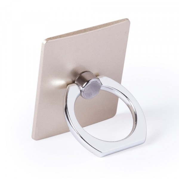 Plakhouder voor smartphone in minimalistisch ontwerp en met elegante zilveren en gouden afwerking. Met telescopische ring en dubbele functie: als houder en als accessoire voor selfies.