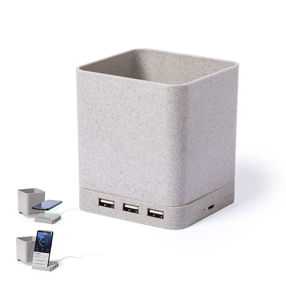 4 in 1 natuurlijn multifunctionele pennenhouder. Vervaardigd in tarwestro, om het gebruik van natuurlijke grondstoffen te stimuleren en de uitstoot van vervuilende stoffen te verminderen.Met pennenhouder, smartphone-houder, draadloze oplader en USB-poort (3xUSB 2.0) functies. Compatibel met smartphones die zijn uitgerust met draadloze oplaadtechnologie. Inclusief 1 meter lange, witte kleurige micro USB-kabel. Gepresenteerd in een aantrekkelijke eco-design box. Gebruiksaanwijzing beschikbaar in het Spaans en Engels.