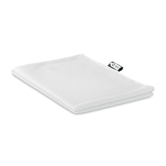 RPET sporthanddoek met hoog vochtabsorberend vermogen in een RPET non woven mesh tas.