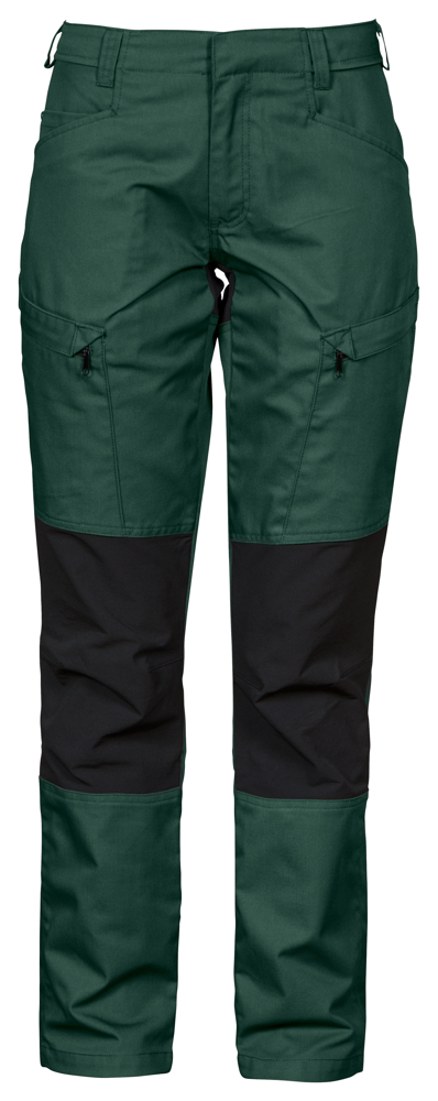 • damesbroek met stretchmateriaal aan zitvlak, kruis en knieën • twee zijbeenzakken: linker met ritssluiting en klep met apart telefoonzakje binnenin en D-ring voor sleutels, rechter ook met ritssluiting en klep met apart telefoonzakje binnenin, twee aparte compartimenten voor o.a. potloden, telefoon, etc • twee ruime achterzakken met klep • verborgen rail om spijkerzakkenzakken te bevestigen (ref: 9042) • verborgen knoop • geen kniezakken