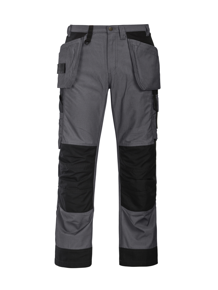 • twee spijkerzakken, binnenin verstevigd met Cordura®, die opgeborgen kunnen worden in de voorzakken • dubbele stoffering op de dijen • verstelbare kniezakken aan de binnenzijde. Verstevigd met Cordura® aan de buitenzijde • twee zijbeenzakken: linker: ruimte voor telefoon, pennen, gereedschappen; rechter: twee aanpasbare hamerhouders, zak voor potlood, duimstokzak en mesknoop • twee ruime achterzakken • twee D-ringen • voorgevormde knieën • Cordura® aan de zijzakken en broekspijpen onderaan