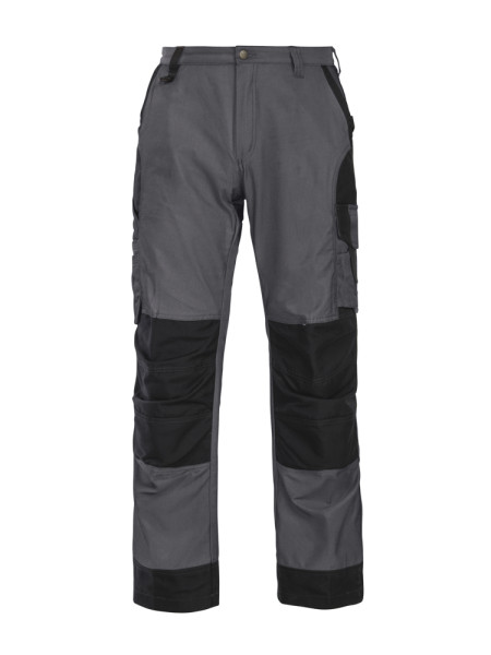 • vlakke voorzijde • verstelbare kniezakken aan de binnenzijde• Verstevigd met Cordura® aan de buitenzijde • twee zijzakken, de rechter met ritssluiting • twee zijbeenzakken: linker: ruimte voor telefoon, pennen, gereedschappen; rechter: twee aanpasbare hamerhouders, zak voor potlood, duimstokzak en mesknoop • Cordura® aan de knieën en onderaan de broekspijpen • twee ruime achterzakken, de linker met klep • twee D-ringen