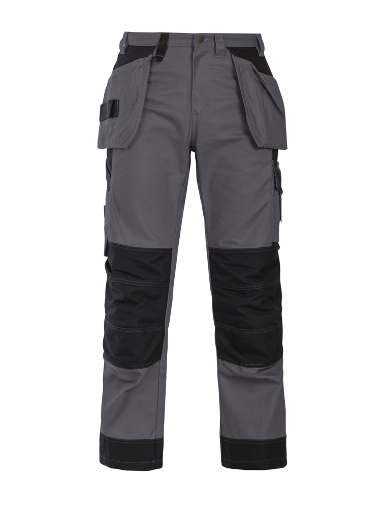 • twee zijbeenzakken: linker: ruimte voor telefoon, pennen, gereedschappen; rechter: twee aanpasbare hamerhouders, zak voor potlood, duimstokzak en mesknoop