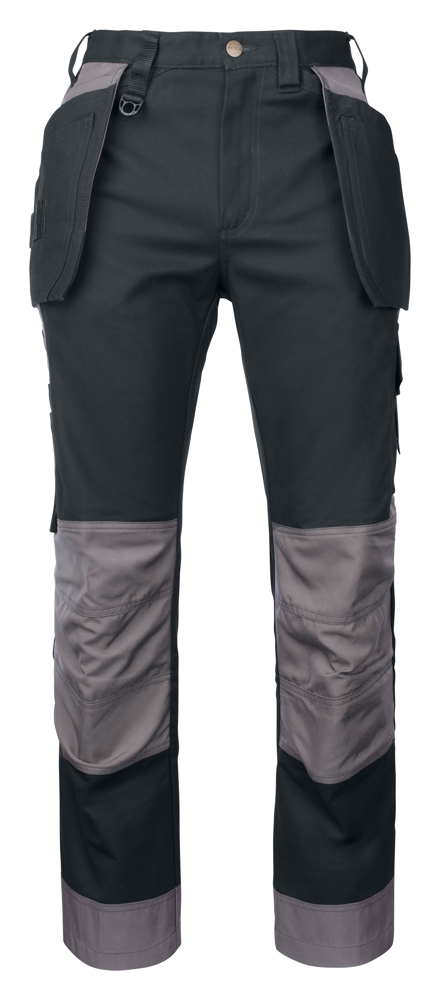 • twee spijkerzakken, binnenin verstevigd met Cordura®, die opgeborgen kunnen worden in de voorzakken • verstelbare kniezakken aan de binnenzijde. Verstevigd met Cordura® aan de buitenzijde • twee ruime achterzakken, de linker met klep • twee zijbeenzakken: linker: ruimte voor telefoon, pennen, gereedschappen; rechter: twee aanpasbare hamerhouders, zak voor potlood, duimstokzak en mesknoop • twee D-ringen • Cordura® aan holsterzakken, knieën en onderaan de broekspijpen