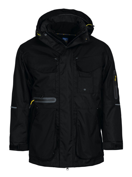• wind- en waterdichte jas • getapete naden • two-way ritssluiting • dubbele stomflap met verborgen drukknopen • afneembare capuchon • aanpasbare taille met trekkoord • twee borstzakken met klep, de linkerzak met telefoon- en pennenhouder • twee gelamineerde zakken met waterdichte ritssluiting: één op de linkermouw en één onder de rechter borstzak. • fleecegevoerde zijzakken met ritssluiting en klep • voorgevormde mouwen met aanpasbare manchetten • uitneembare, gewatteerde voering/jas die apart gedragen kan worden (artikel 3423) • WP 8000, MVP 8000